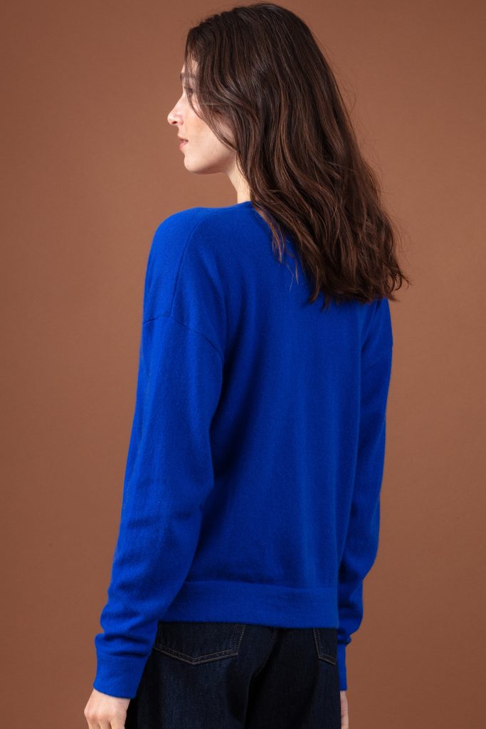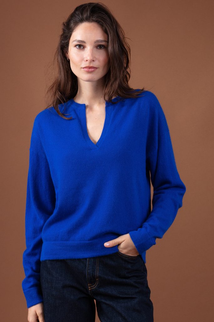 Knitted in 100% cashmere 2-ply, gauge 12, it features a straight and slightly loose fit for comfort without bulk. The discreet mao collar is enhanced by a 17 cm opening, adding a touch of refined detail.